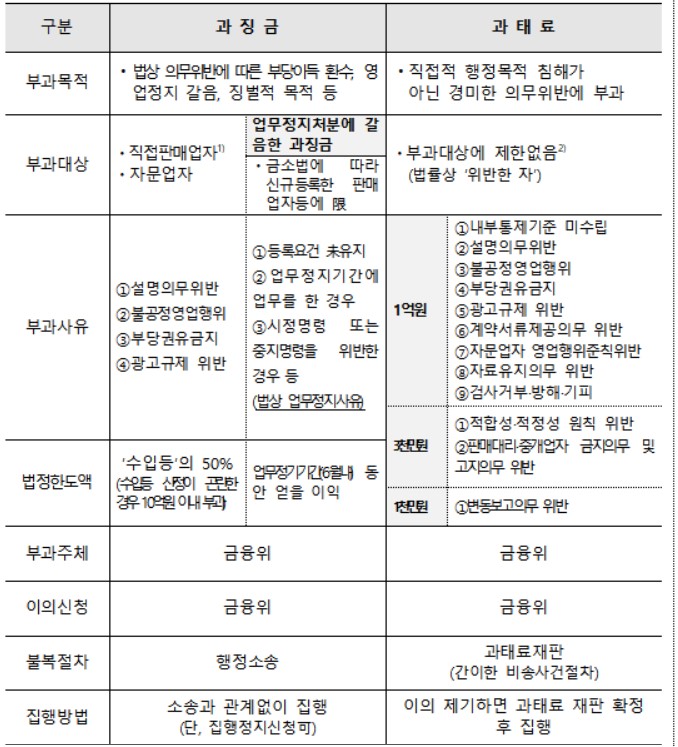 금소법상 과징금 및 과태료 제도 비교위법행위로 인한 부당이득 환수 등을 통한 규제의 실효성 확보를 위해 과징금 제도가 도입됐다. 금융상품직접판매업자 또는 자문업자가 주요 판매원칙을 위반할 경우 위반행위로 인한 수입 등의 50%까지 과징금이 부과된다. 업무가 정지될 경우 금융소비자 불편 등 부정적 영향을 초래할 우려가 있어 업무정지 처분에 갈음해 금전제재인 과징금을 부과한다.