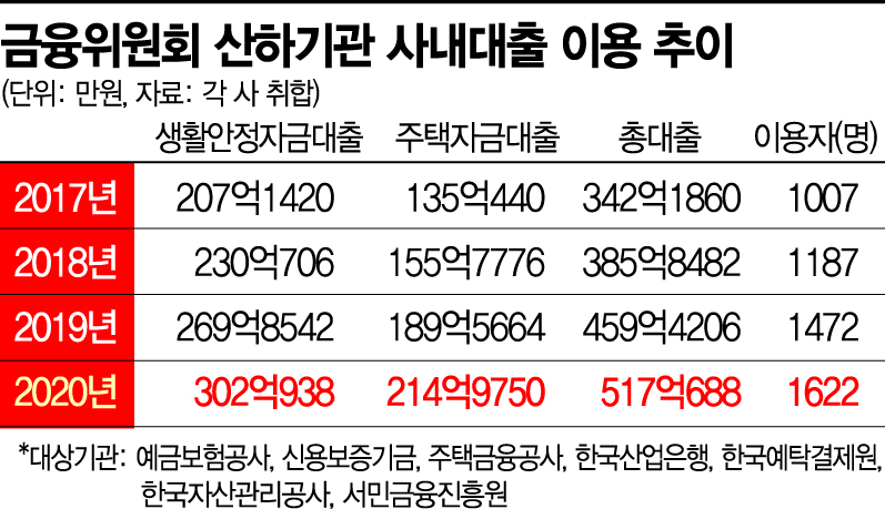 [아시아경제 송승섭 기자]지난해 금융위원회 산하 금융공기업들의 사내대출 규모가 3년 새 174억원 늘어난 517억원에 달하는 것으로 파악됐다. 특히 일부 공기업의 경우 시중은행보다 낮은 연 1~2% 초반대 초저금리로 대출을 해준 것으로 나타났다. 금융당국이 코로나19에 따른 리스크를 이유로 시중은행에 대출 옥죄기를 주문한 가운데 규제 사각지대에 있는 공기업 직원들과 돈 줄이 막힌 서민들과의 형평성 논란이 제기된다.