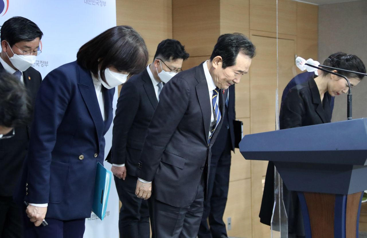 정세균 국무총리가 29일 정부서울청사 브리핑실에서 반부패정책협의회 결과 브리핑을 마친 뒤 인사하고 있다. 이날 브리핑에는 홍남기 부총리 겸 기획재정부 장관, 박범계 법무부 장관, 전해철 행정안전부 장관, 변창흠 국토교통부 장관, 김현수 농림축산식품부 장관, 은성수 금융위원장, 전현희 국민권익위원장, 구윤철 국무조정실장 등이 참석했다. 2021.3.29 [이미지출처=연합뉴스]
