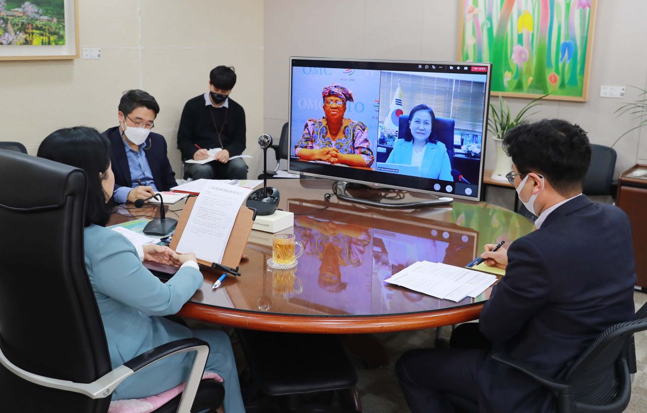 유 본부장과 오콘조이웰라 사무총장은 30일 화상으로 첫 공식면담을 했다. 두 사람은 최근 WTO 위기론이 제기되는 상황에서 오는 11월 예정인 차기 각료회의까지 실질적 성과를 도출해 WTO가 다자무역체제 회복을 주도해야 한다는 데 뜻을 모았다.