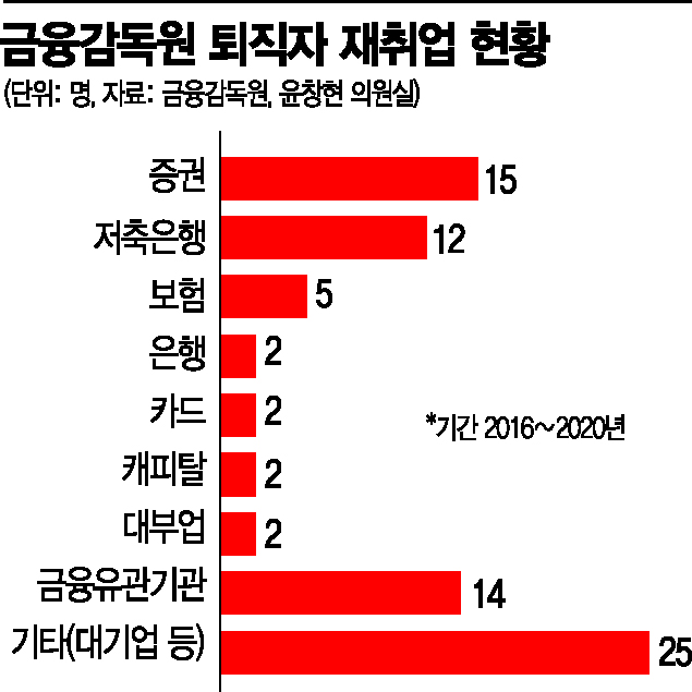 공직자윤리위 심의를 거친 직원을 기준으로 증권사로 재취업한 경우가 15명으로 가장 많았다. 이어 저축은행 12명, 보험 5명, 은행 2명, 카드 2명, 캐피털 2명, 대부업 2명 등의 순이었다. 협회, 연구소 등 금융유관기관으로 이동한 간부는 14명이었고 나머지 25명은 대기업 등으로 옮겼다.