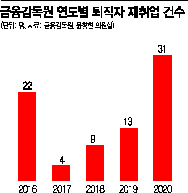 재취업 퇴직자는 지난해 눈에 띄게 급증했다. 전년 대비 138.5% 늘어난 31명이 재취업했다. 금감원 재취업 수는 2016년 22명에서 2017년 4명으로 줄었다가 2018년 10명, 2019년 13명, 지난해 31명으로 뛰었다.