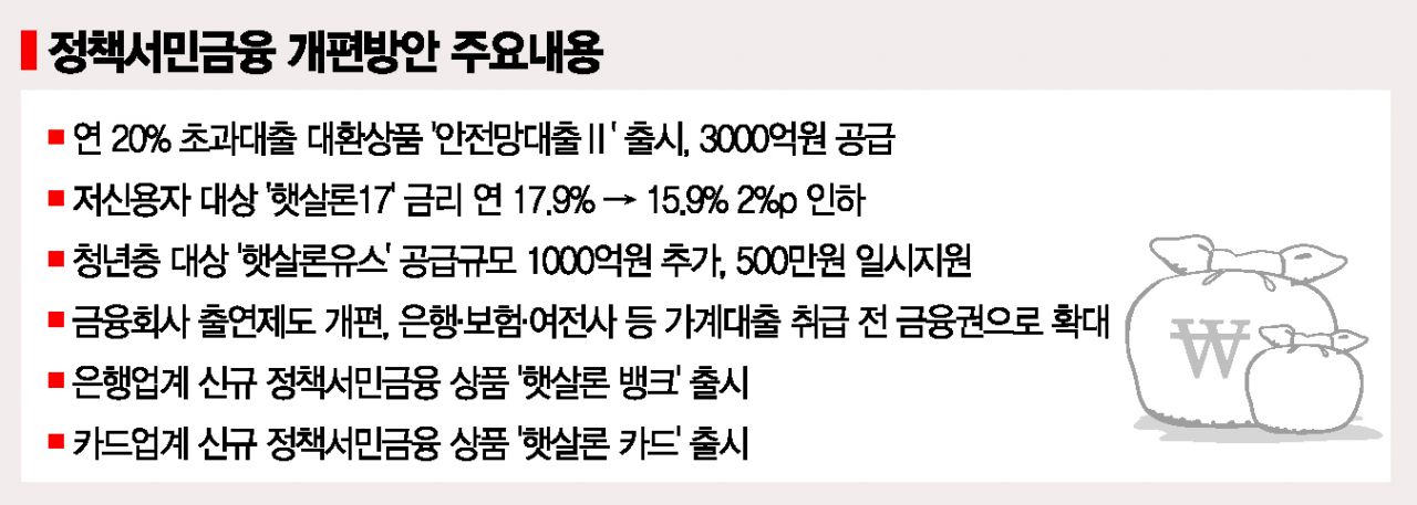 개편방안은 저소득·저신용자에 대한 정책서민금융 안전망 확충에 초점이 맞춰져 있다. 상환능력이 있음에도 기존 고금리 대출 만기 시 재이용이 어려워진 사람을 위해 하반기부터 3000억원 한도로 대환상품 ‘안전망 대출Ⅱ’를 지원한다. 하반기부터 햇살론17 금리가 15.9%로 2%포인트 인하되고, 이후 시장상황에 따라 금리를 추가로 인하한다. 제도권 금융 이용이 어려운 청년층을 지원하는 ‘햇살론유스’ 공급 규모를 기존 계획보다 1000억원 추가한다.