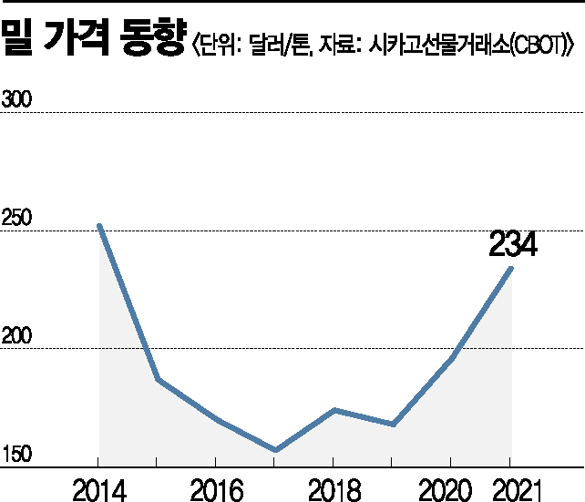 코로나19 영향으로 물류가 원활하지 않은 데다 세계 최대 밀 생산국 중 하나인 미국이 이례적 한파로 작황이 부진한 영향이다. 여기에 주요 생산국인 러시아가 식량 안보를 이유로 밀 수출에 수출세를 부과한 영향까지 겹쳤다. 연일 밀 가격이 오르며 제분업계에서는 밀가루 가격 인상과 관련한 논의가 지속되고 있다. 곰표 밀가루 등을 생산하는 대한제분은 최근 밀가루 가격 인상을 검토 중이다.
