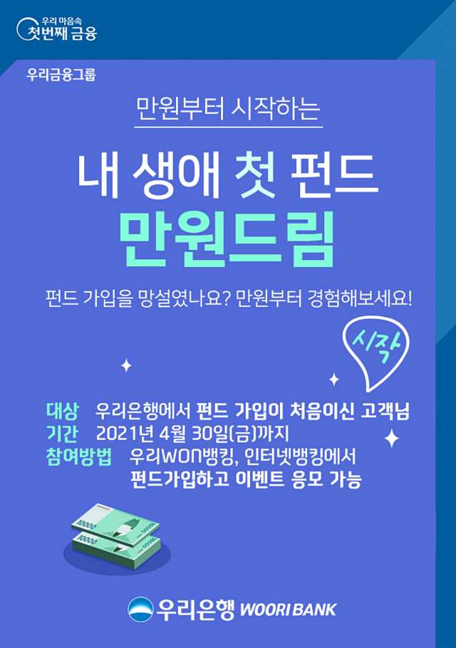 [아시아경제 성기호 기자] 우리은행이 비대면으로 우리은행 펀드를 최초로 가입하는 고객을 대상으로 ‘만원부터 시작하는 내 생애 첫 펀드’ 이벤트를 30일까지 실시한다고 4일 밝혔다.