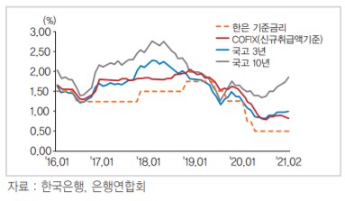 송민규 한국금융연구원 선임연구위원은 '가계부채 리스크 관리를 위한 주요 모니터링 사항' 보고서를 통해 금리 상승에 따른 가계부채 리스크가 가시화될 가능성은 낮다고 진단했다. 당분간 기준금리가 낮게 유지될 것으로 예상되는 상황에서 가계부채 금리에 영향을 주는 0~3년물 금리의 상승은 제한적이라는 판단에서다.