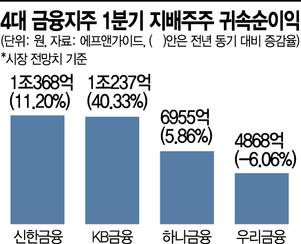 장사 잘한 금융지주…4대 금융지주 합산 순이익 15% 증가 전망6일 금융권에 따르면 올해 1분기 4대 금융지주의 순이익 합계는 3조원을 거뜬히 넘긴 3조2428억원을 기록, 지난해 같은기간 2조8371억원 대비 15% 가량 증가할 것으로 전망됐다. 금융정보 제공업체 에프앤가이드가 집계한 4대 금융지주 1분기 지배주주 귀속순이익 시장전망치(컨센서스)는 신한금융 1조368억원, KB금융 1조237억원, 하나금융 6955억원, 우리금융 4868억원 순이다.