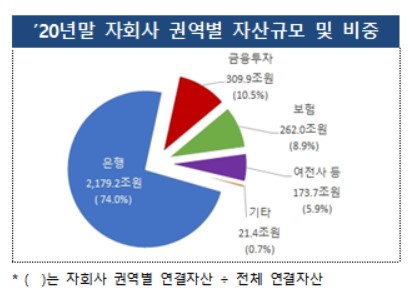 최근 3년간 국내 금융회사(은행, 보험, 금융투자, 여전, 저축은행, 상호금융, 금융지주(별도)) 총자산 대비 금융지주 연결총자산 비중은 2018년말 38.9%에서 2019년말 45.8%, 2020년말 46.3%로 점차 증가하는 추세다.