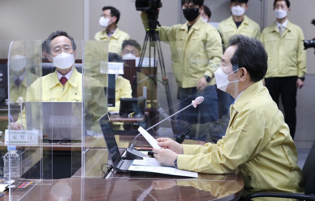 정세균 국무총리가 7일 오전 전주시 전북도청 재난종합상황실에서 열린 신종 코로나바이러스 감염증(코로나19) 대응 중앙재난안전대책본부 회의를 주재하며 발언하고 있다. 왼쪽은 송하진 전북도지사. 2021.4.7 [이미지출처=연합뉴스]