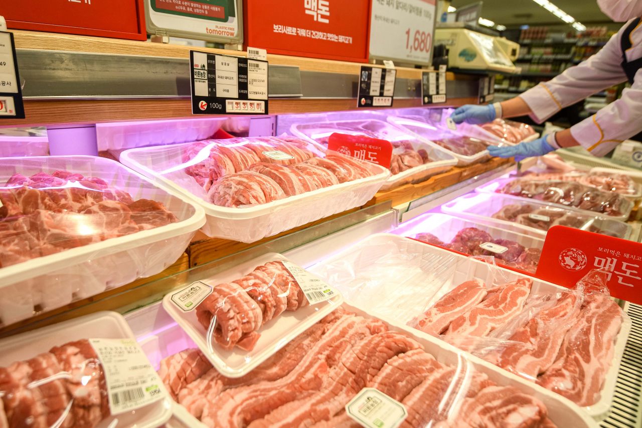 최근 돼지 도축마릿수 증가로 돼지고기 공급은 증가했으나 재난지원금 등에 따른 소비 증가로 돼지고기 가격이 상승한 가운데 2일 서울 한 대형마트 축산코너 판매대에 돼지고기가 진열되고 있다./강진형 기자aymsdream@
