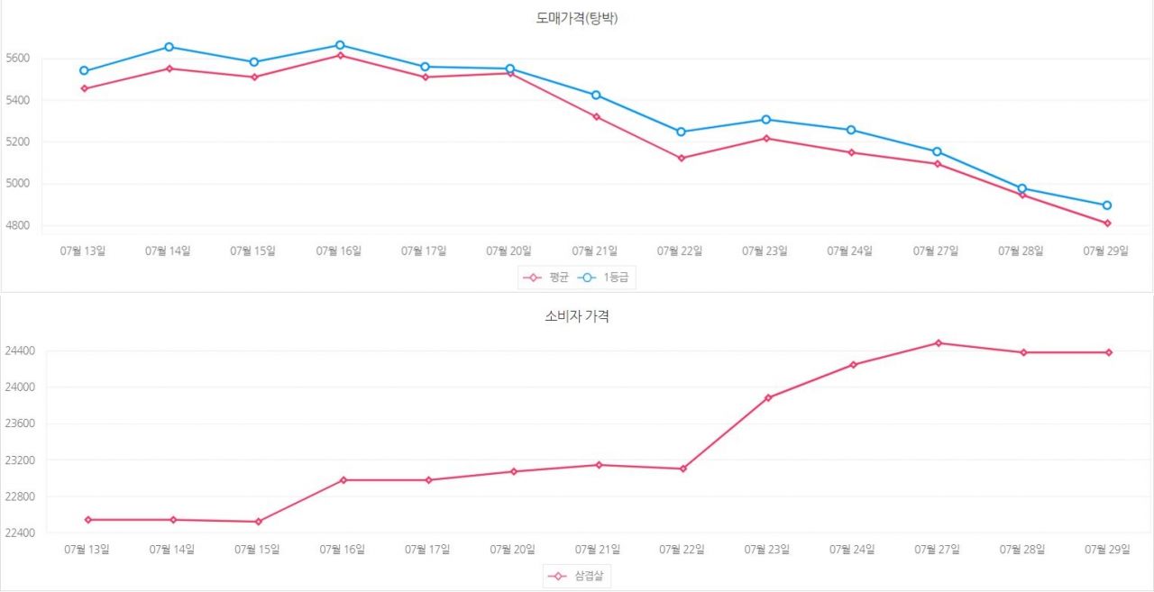 30일 축산물품질평가원 축산유통정보에 따르면 돼지고기 삼겹살 소비자가는 kg당 2만4375원으로 집계됐다. 지난 13일 kg 당 2만2500대이던 가격이 불과 보름 사이에 2000원 가까이 상승했다. 반면 도매가는 연일 하락세를 보이고 있다. 13일 도매시장에서 kg 당 5454원에 거래되던 돼지고기(탕박)는 29일 4806원으로 약 650원 하락해 소비자가와 도매가의 격차는 연일 벌어지고 있다.