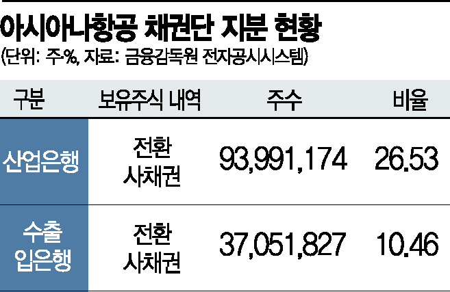 이미 산업은행과 수출입은행은 지난해 4월 아시아나에 총 1조6000억원을 지원했다. 여기에는 아시아나가 발행한 5000억원 규모의 영구채 인수가 포함됐다. 이어 올해 4월 아시아나에 추가로 1조7000억원을 지원한 것과 별개로 영구채 3000억원을 또 인수했다. 이는 주식 전환이 가능한 채권으로 산업은행과 수출입은행은 이달 초 공시를 통해 아시아나항공 전환사채(CB)를 각각 9399만1174주, 3705만1827주를 보유하고 있다고 밝혔다. 주식으로 전환하면 각각 26.53%, 10.46%의 지분율을 확보하게 된다. 총 보유 지분은 36.9%로 현재 아시아나의 대주주인 금호산업(30.7%)을 앞선다.