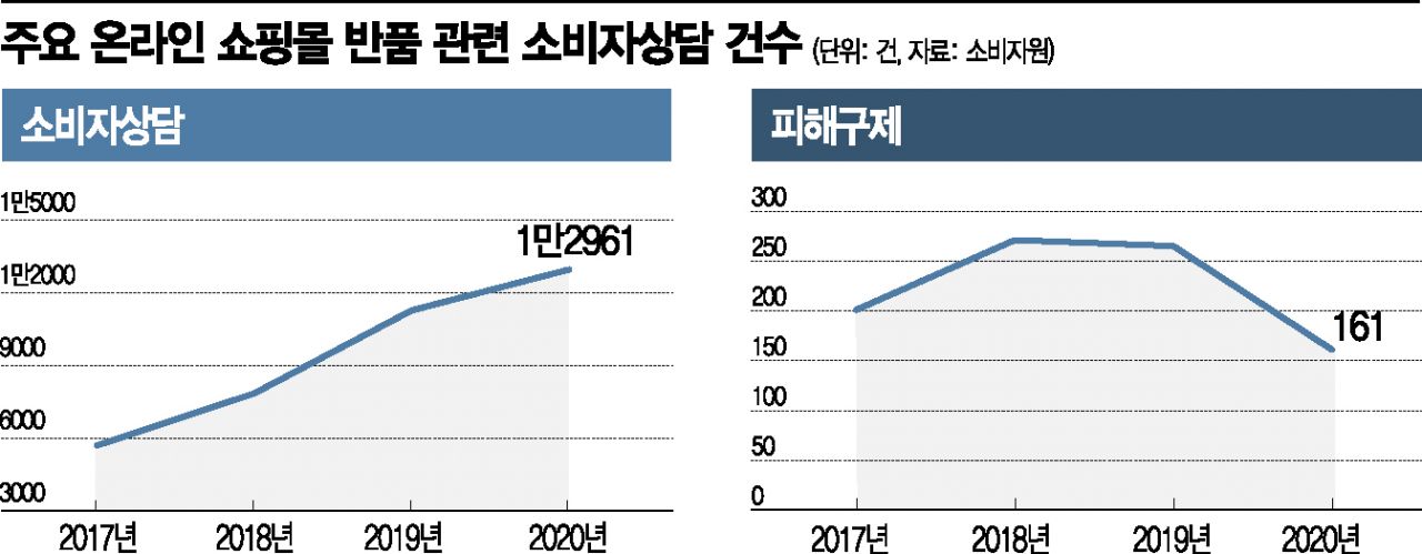 실제 반품과 관련해 소비자원을 통한 피해구제까지 이어진 사례는 2017년 201건, 2018년 271건, 2019년 265건, 2020년 161건, 2021년 3월까지는 48건이었다. 이는 소비자원이 분쟁 조정에 착수하기 전에 소비자 상담 등을 통해 문제가 해결된 경우도 많아진 것으로 분석된다.