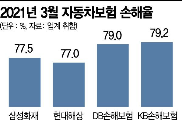 8일 손해보험업계에 따르면 지난달 삼성화재·현대해상·DB손해보험·KB손해보험의 3월 자동차보험 손해율은 77.0~79.2%를 기록했다. 이들 4개사의 자동차보험 점유율은 84.7%에 달한다. 각사 별로는 삼성화재 77.5%, 현대해상 77.0%, DB손해보험 79.0%, KB손해보험이 79.2%를 기록했다.