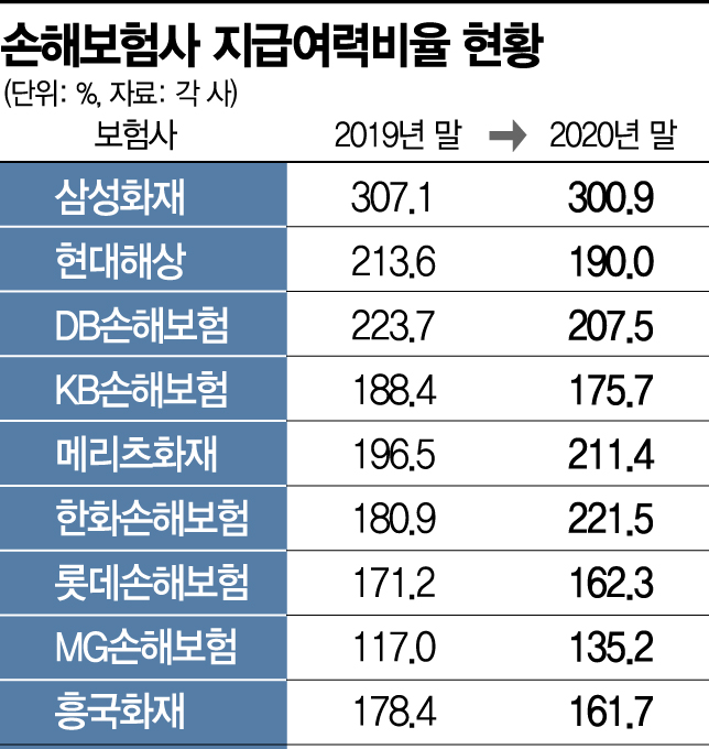 손보사 중에 RBC비율이 가장 양호한 삼성화재도 2019년 307.1%에 달했던 RBC비율이 300.9%로 6.2%포인트 내렸다.