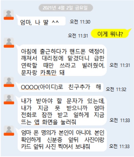 금융당국 관계자는 "가족이나 지인으로 부터 핸드폰 고장, 분실 등으로 연락이 안된다는 메신저를 받을 경우 메시지 대화를 중단하고 유선통화 등으로 직접 확인해야 한다"며 "출처가 불분명한 앱 설치를 요구하거나 신분증이나 개인정보를 요구할 경우 무조건 거절해야 한다"고 당부했다.
