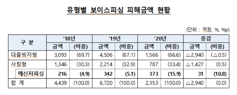 15일 금융감독원에 따르면 지난해 보이스피싱 피해액은 2353억원으로 전년 보다 65.0%나 감소했다. 하지만 가족이나 지인을 사칭한 메신저피싱 피해액은 342억원에서 373억원으로 9.1% 증가한 것으로 나타났다.