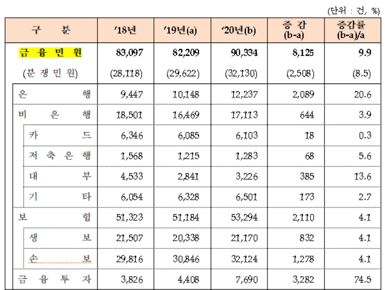 지난해 금융민원은 전년 8만2209건 대비 9.9% 증가한 9만334건을 기록했는데 이 가운데 보험 민원은 5만3294건으로 전체 금융민원의 59%를 차지했다. 금융민원 10건 중 6건이 보험이란 얘기다.