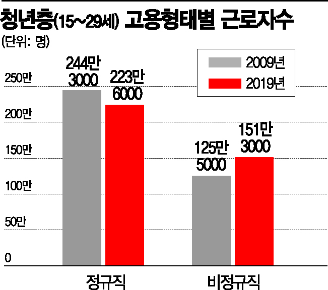 같은 기간 정규직의 월평균 급여는 155만4000원에서 229만5000원으로 47.7% 급증했지만 비정규직은 119만3000원에서 140만6000원으로 17.9% 늘어나는 데 그쳤다. 10년 간(2009년 대비 2019년)의 소비자물가상승률(18.5%)에도 미치지 못하는 청년 비정규직이 더 늘어난 셈이다.