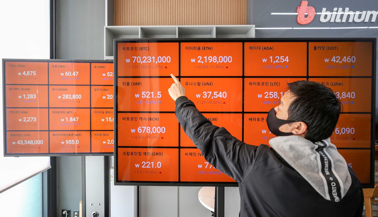 비트코인이 7천만원을 돌파하며 최고치를 경신한 14일 서울 강남구 빗썸 강남고객센터 시황판에 비트코인을 비롯한 가상화폐들의 가격이 표시되고 있다./강진형 기자aymsdream@