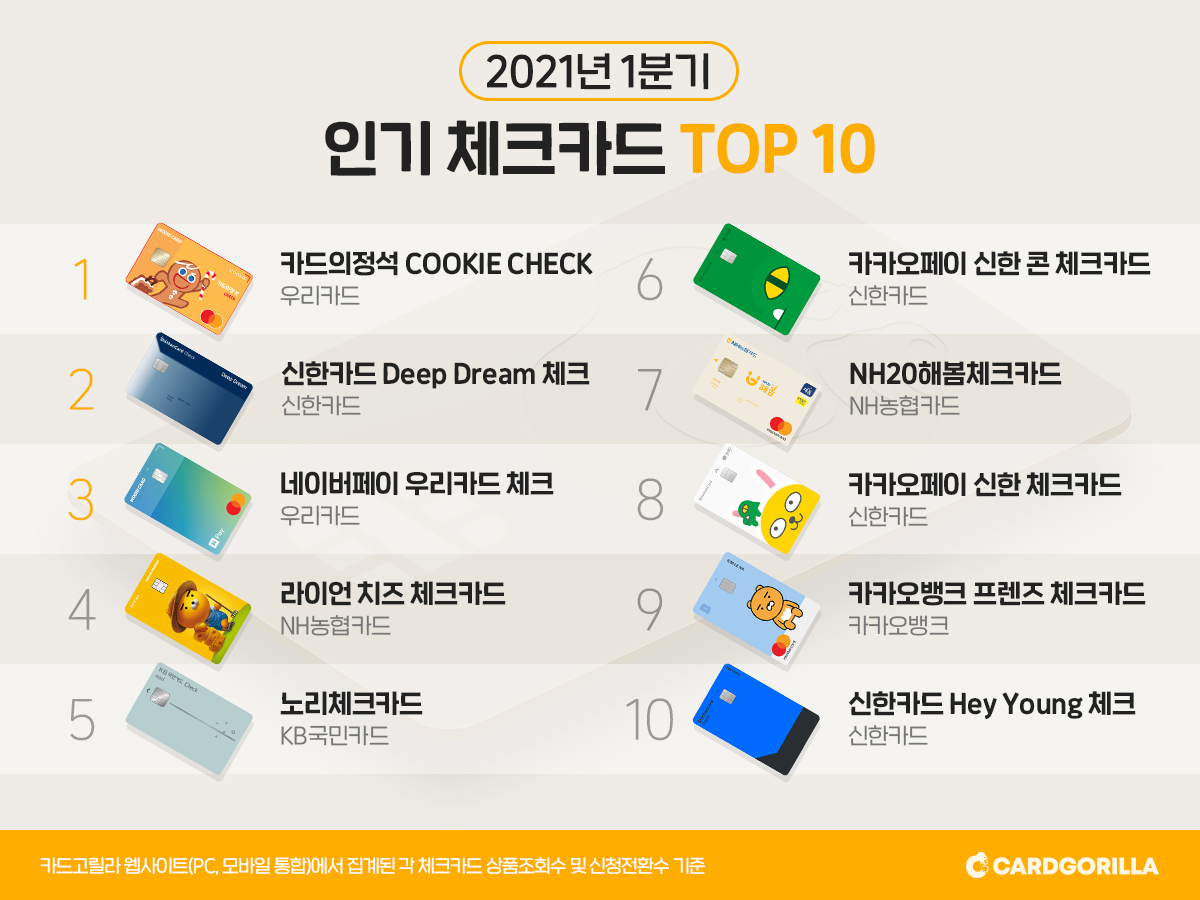 17일 국내 최대 신용카드 전문사이트 카드고릴라에 따르면, 2021년 1분기 인기 체크카드 톱10에서 '우리카드 카드의정석 쿠키체크'가 1위를 차지했다. 이번 결과는 올 1월 1일부터 3월 26일까지 카드고릴라 웹사이트에서 집계된 체크카드 상품 조회수와 신청 전환수를 분석한 결과다.