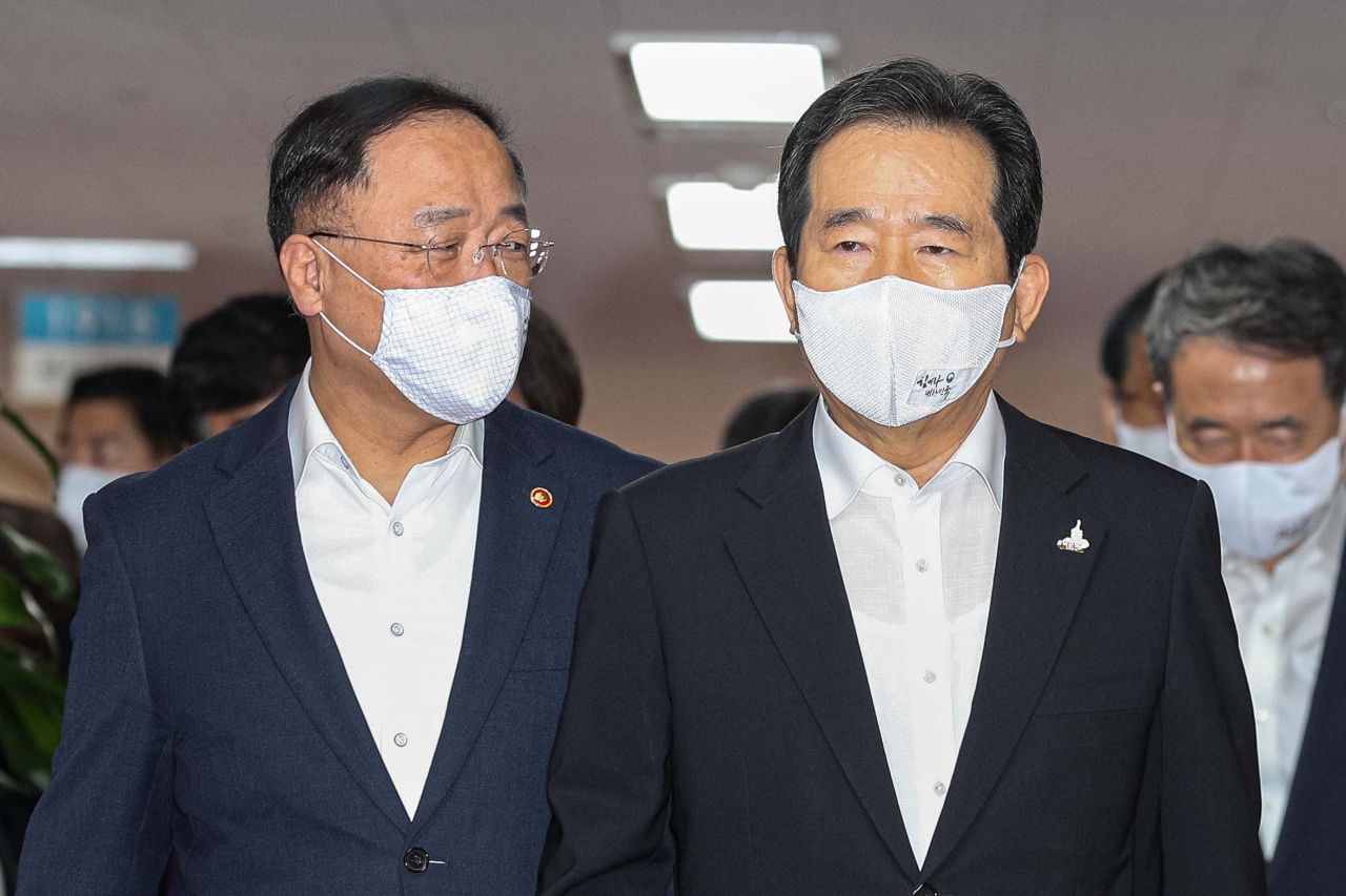 정세균(오른쪽) 국무총리와 홍남기 경제부총리 겸 기획재정부 장관이 31일 서울 종로구 정부서울청사에서 열린 '임시국무회의'에 참석하기 위해 이동하고 있다./강진형 기자aymsdream@