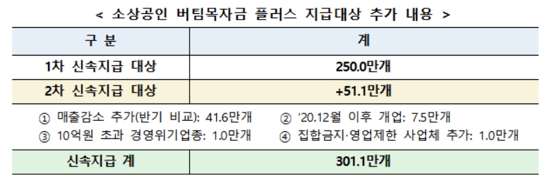 아울러 중기부는 버팀목자금 플러스 2차 신속지급 대상을 51만1000개 추가한다. 19일부터 지원대상자에 안내문자를 발송하고 온라인 신청을 받을 계획이다.