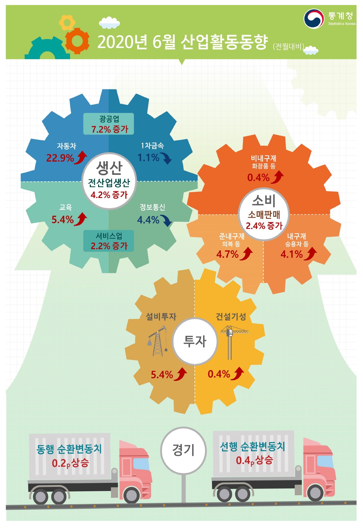 [세종=아시아경제 김현정·주상돈 기자] 지난달 생산과 소비, 투자가 모두 증가한 것으로 나타났다.