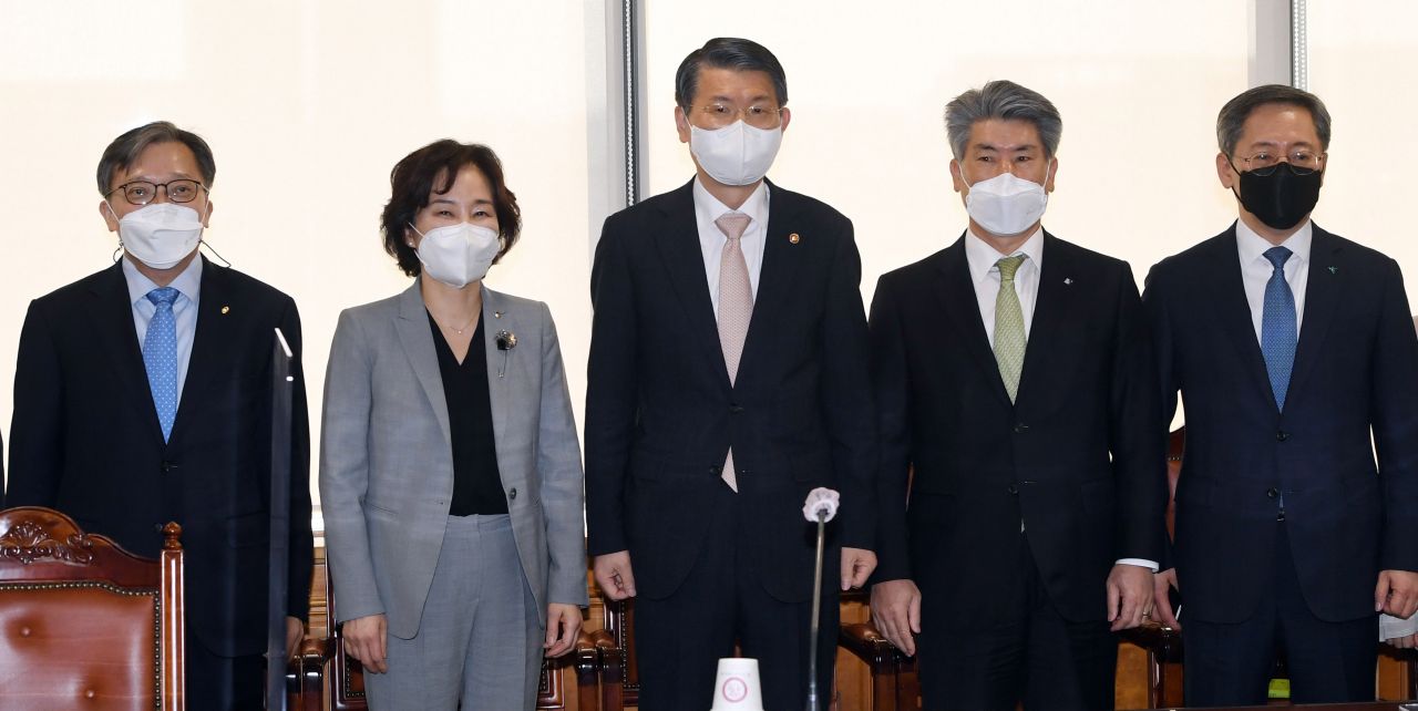1일 오전 서울 중구 은행회관에서 열린 은행권 CEO 간담회에서 참석자들이 기념촬영을 하고 있다. (왼쪽부터 최성일 금융감독원 은행 중소서민금융담당 부원장, 김은경 금융감독원 금융소비자보호처장, 은성수 금융위원회 위원장, 윤종원 기업은행장, 허인 국민은행장) /문호남 기자 munonam@