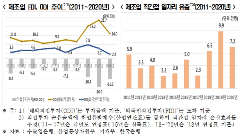 지난 10년간 제조업 기업들의 해외투자가 국내로 유입되는 외국인투자를 크게 압도해 일자리 유출이 발생한 것으로 파악됐다. 한경연에 따르면 2011~2020년 제조업의 해외직접투자는 연평균 12조4000억원에 달한 반면, 외국인 직접투자는 해외직접투자의 절반도 안 되는 연평균 4조9000억원이었다. 같은 기간 제조업의 직접투자 순유출액(FDI-ODI)은 연간 7조5000억원 발생했고, 이에 따른 직간접 일자리가 매년 4만9000개(누적 49만1000개) 빠져나간 것으로 분석됐다.