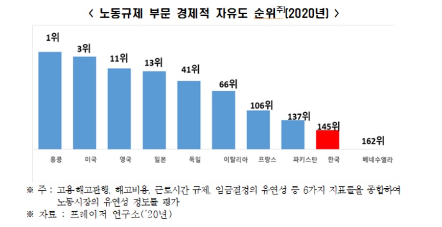 이처럼 국내 제조업 일자리가 해외로 유출되는 원인에 대해 한경연은 "한국의 각종 기업관련 규제, 그 중에서도 경직적인 노동시장이 국내 투자와 고용의 발목을 잡고 있는 것으로 보인다"고 주장했다. 캐나다 정책연구기관 프레이저 연구소에 따르면 지난해 기준 한국의 노동시장 규제 관련 경제자유도 순위는 조사대상 162개국 중 145위로 노동규제가 매우 엄격한 수준으로 나타났다.