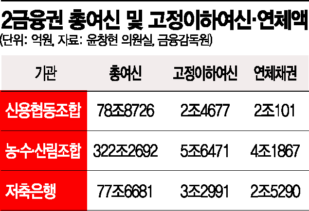 20일 금융감독원과 윤창현 국민의힘 의원실에 따르면 지난해 말 기준 저축은행과 신용협동조합, 농·수·산림조합의 고정이하여신은 11조4129억원으로 집계됐다. 전년 대비 8963억원 증가한 수치다. 업권별로는 농·수·산림조합이 5조6471억원으로 가장 많았고, 저축은행 업계가 3조2991억원을 기록했다. 신협의 경우 총 2조4677억원이었다.