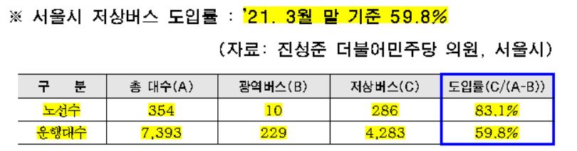 20일 국회 국토교통위원회 소속 진성준 더불어민주당 의원이 서울시·서울교통공사로부터 제출받은 자료에 따르면, 서울시 저상버스 도입률은 3월말 기준 59.8%에 불과했다.