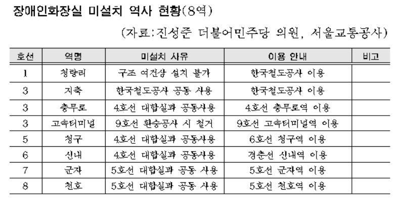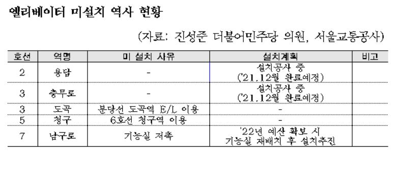 엘리베이터나 장애인 화장실이 없는 수도권 지하철 역사도 있었다. 엘리베이터가 없어 교통약자가 이용하기 어려운 수도권(1~9호선 기준) 지하철역은 4월 기준 총 5곳(2호선 용답, 3호선 충무로·도곡, 5호선 청구, 7호선 남구로)이었다. 서울교통공사는 진성준 의원실에 낸 답변서에서 "2호선 용답역과 충무로역은 엘리베이터 설치공사를 진행중이고 올 12월 완료할 예정이며, 남구로역은 내년 예산확보 후 설치를 추진할 계획"이라고 밝혔다. 3호선 도곡역과 5호선 청구역에는 아직 설치 계획이 없다.