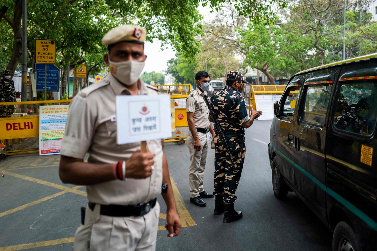 인도가 신종 코로나바이러스 감염증(코로나19) 확산으로 비상인 가운데 20일(현지시간) 수도 뉴델리에서 경찰이 도로를 막고 경계를 서고 있다. 뉴델리는 코로나19 하루 확진자가 2만5천여 명에 달하는 등 급증세를 보이자 전날 오후 10시부터 26일 오전 5시까지 일주일간 봉쇄령을 내렸다. [이미지출처=연합뉴스]