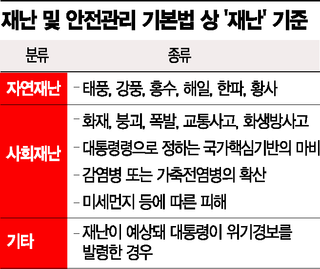 해당되는 재난의 범위도 모호하다. 발의된 법안을 살펴보면 재난의 기준은 태풍·홍수·호우 등 자연 재해 등을 비롯, 화재·붕괴·폭발 등 사회적 재난, 기타 대통령이 경계 이상의 위기 경보를 발령할 수 있는 재난 등 생각할 수 있는 모든 부분이 총 망라돼 있다. 이와 함께 현재 사회적 문제가 되고 있는 감염병과 가축전염병을 비롯, 미세먼지와 환경오염 사고 등도 일정 규모 이상이 되면 재난으로 포함된다. 만약 미세먼지가 심해져 피해가 막대하다고 판단되면 은행에 원금 탕감을 요구할 수 있게 되는 것이다.