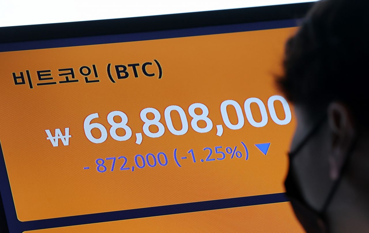 비트코인 가격이 7천만원 밑으로 하락한 21일 오후 서울 강남구 빗썸 강남고객센터 모니터에 비트코인 시세가 표시되고 있다. [이미지출처=연합뉴스]