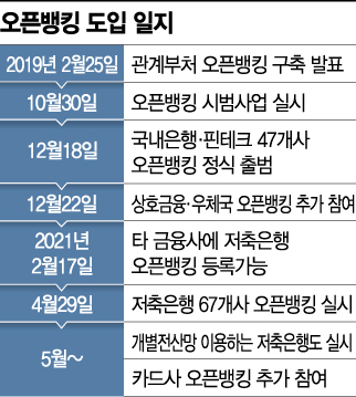 오픈뱅킹이란 송금·결제망을 표준화시켜 하나의 금융사 앱에서 여러 금융사의 금융업무를 처리하는 서비스다. 지난해 10월 10개 은행의 시범 서비스를 거쳐, 12월 핀테크 기업을 포함한 47개사에서 시작됐다.