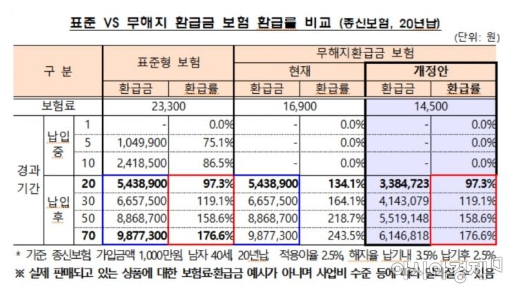 하지만 앞으로는 무해지환급금보험도 20년 납입 후에도 134%가 아니라 97.3%로 환급률이 제한된다. 환급금은 543만원에서 338만원으로 크게 줄어들게 된다. 납입 후 30년이나 40년 등의 환급금도 표준형 보험 환급률에 맞춰서 낮아진다.