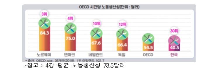 시간당 노동생산성은 노르웨이가 84.3달러로 한국(40.5달러)보다 2배 이상 높았다. 우리나라의 노동생산성 수준은 OECD 36개국 중에서도 30위로 하위권에 속했으며, 전년보다 순위가 한 단계 더 떨어졌다.