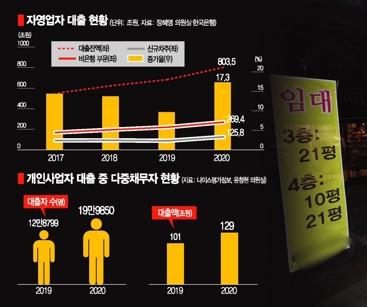 전문가들은 자영업자 대출 지표가 경제 위기의 임계점에 다다랐다고 우려한다. 김대종 세종대 경영학부 교수는 "국가가 (사회적 거리두기, 집합금지 등) 외출과 소비를 막았으니 자영업자들이 기댈 수단이 빚밖에 없었던 것"이라며 "이제 시중은행에서 대출을 못 받는 자영업자들이 사금융으로 몰려가면서 문제가 더 심각해지고 있다"고 지적했다. 조동근 명지대학교 경제학과 교수도 "급증하는 자영업자 대출이 한국 경제의 위험신호"라며 "사회적 거리두기가 장기간 이어지고 백신 접종도 빠르게 이뤄지지 못하면서 천문학적으로 불어난 것"이라고 비판했다.개인사업자 대출받은 자영업자 10명중 1명은 다중채무◆빚 돌려막기로 버티다 폐업 속출= 빚으로 버틴 자영업자 중에선 금융사 3곳 이상에서 돈을 빌린 다중채무자도 많다. 국회 정무위원회 소속 국민의 힘 윤창현 의원이 나이스평가정보에서 받은 자료에 따르면 지난해 개인사업자 다중채무자 수는 19만9850명으로 1년 전(12만8799)보다 55% 늘었다. 개인사업자 대출을 받은 자영업자 254만4583명 중 19만9850명(약 8%)이 다중채무자인 것이다. 즉 자영업자 10명 중 1명가량이 여러 금융사 빚에 허덕인다는 얘기다. 금액으로는 전체 개인사업자 대출액 557조원 가운데 129조원(23.2%)이 다중채무자가 빌린 돈이었다. 여기에 자영업자가 가계대출로 빌린 돈을 더하면 다중채무자 수는 급격히 늘어날 것으로 분석된다. 자영업자들은 기업대출로 분류되는 개인사업자 대출과 가계대출인 주택담보대출이나 신용대출 등을 함께 가지고 있는 경우가 많다.