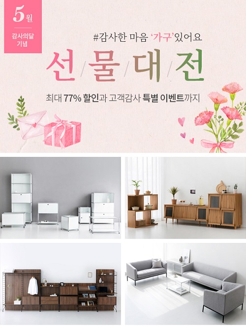 어린이날, 어버이날, 스승의날 등 기념일이 많은 5월을 감사의 달로 지정하고 최대 77% 가구 할인과 모듈가구3+1이벤트, 베스트 후기 상품 특가 등 다양한 제품과 특별 이벤트를 선보인다.