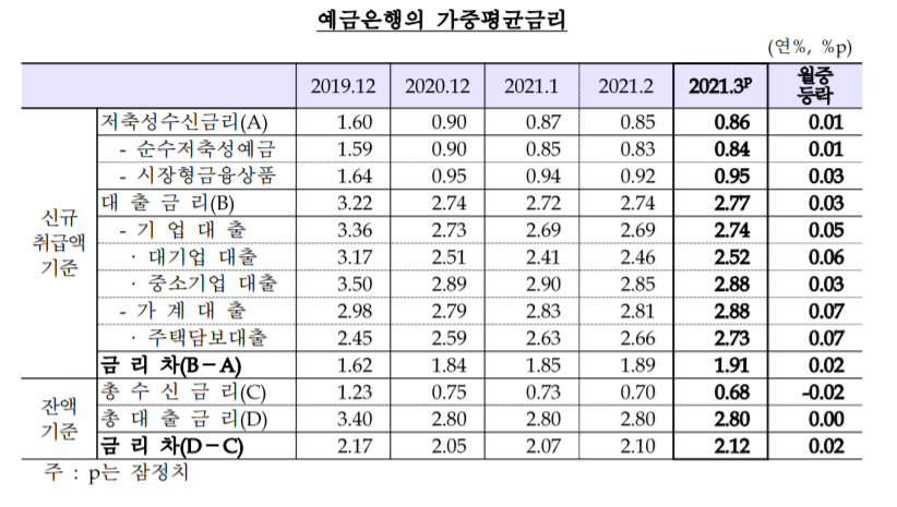 이에 따라 예금은행의 대출 금리와 저축성수신 금리의 차이, 즉 예대마진은 2.12%포인트로 2월(2.10%포인트)보다 0.02%포인트 늘었다.