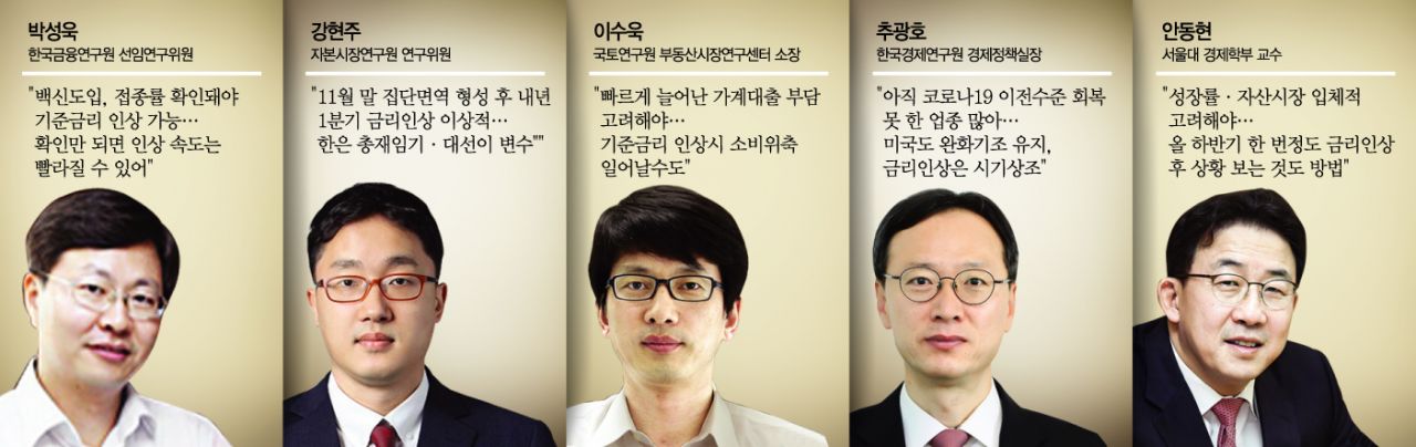 반면 안동현 서울대 경제학부 교수는 "미국발(發) 백신효과로 인플레이션 가능성이 있다는 점, 자산시장 급등을 고려하면 하반기 중 기준금리를 한국이 먼저 한 번 정도 올린 후 속도를 조절하는 것도 방법"이라고 했다. 그는 "0.5%에서 0.75%까지 금리를 올렸다고 해서 갑자기 소비나 투자가 위축되진 않을 것"이라고 했다.