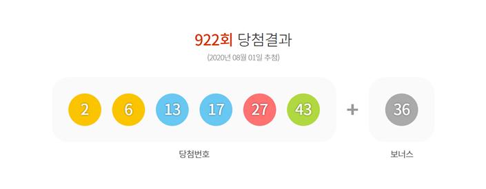 [아시아경제 최대열 기자] 1일 진행한 제922회 로또복권 추첨에서 1등 당첨번호로 2, 6, 13, 17, 27, 43번이 뽑혔다. 2등 보너스 번호는 36이다.