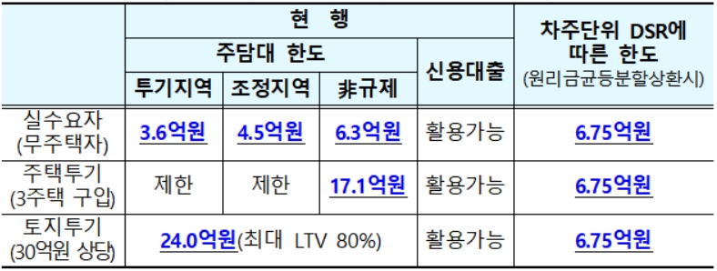 이렇게 되면 대출이 줄어드는 효과가 생깁니다. 연 소득 8000만원인 사람은 9억원의 주택을 30년 만기로 산다고 가정해볼까요. 현재 실수요자는 투기지역에서 3억6000만원을, 비규제지역에서 6억3000만원을 빌릴 수 있습니다. 3주택을 산다면 비규제지역에서 17억1000만원을 빌릴 수 있고요. 하지만 차주별로 DSR이 적용되면 누구나 대출은 6억7500만원 밖에 받지 못하는 식이죠.