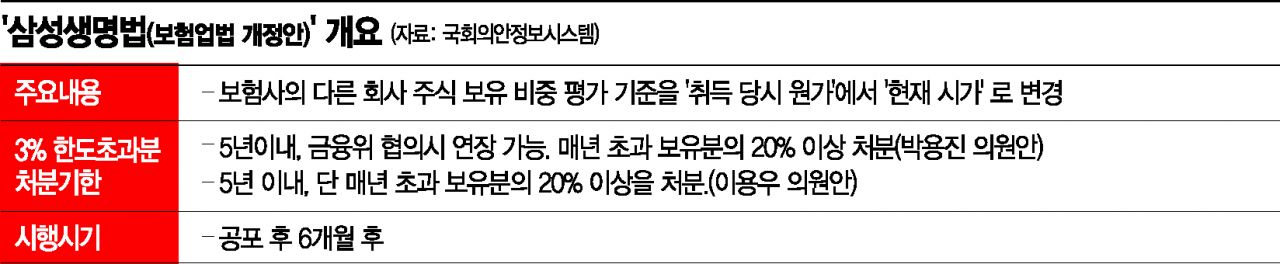 1980년대에 삼성생명이 삼성전자 지분을 취득한 원가는 5400억원이지만, 이를 시가(3일 10시 기준 8만1200원)로 계산하면 약 41조원 규모에 달한다. 개정안에 통과되면 삼성생명은 총자산의 3%인 10조원을 초과하는 31조원 규모의 삼성전자 지분을 팔아야 한다.