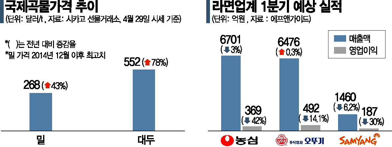 라면업계의 저조한 1분기 실적은 라면의 생산단가를 좌우하는 주요 원재료인 밀, 대두, 팜유 등의 가격이 최근 1년 사이 모두 급등했기 때문이다. 지난 26일 기준 5월 팜유 선물은 말레이시아 인도복합상품거래소(MCX)에서 10t당 1189링깃에 거래됐는데, 1년 전과 비교해 두 배에 달하는 가격이다.
