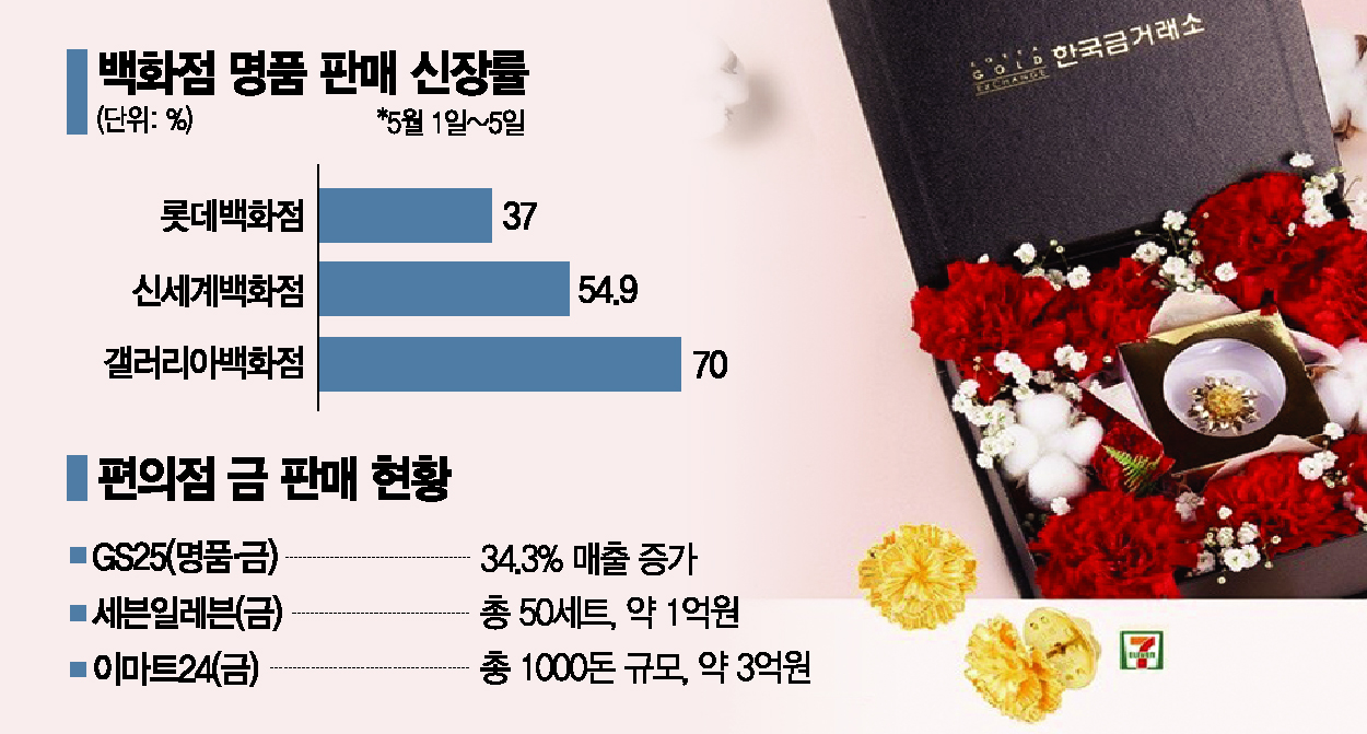 세븐일레븐은 한국금거래소와 함께 순금 카네이션 배지 1돈으로 구성된 골드 카네이션과 골드바(5돈·10돈)를 예약 판매 중이다. 현재 총 50세트(약 1억원 상당)가 팔렸고, 남은 판매 기간에 매출이 더 늘어날 것으로 보고 있다. 이마트24는 지난달 27일부터 3일까지 순금 카네이션, 순금 골프공, 순금 골드바 등을 예약 판매했다. 이번에 판매된 순금 상품은 총 1000돈 규모로, 이를 금액으로 따지면 약 3억원에 달한다.