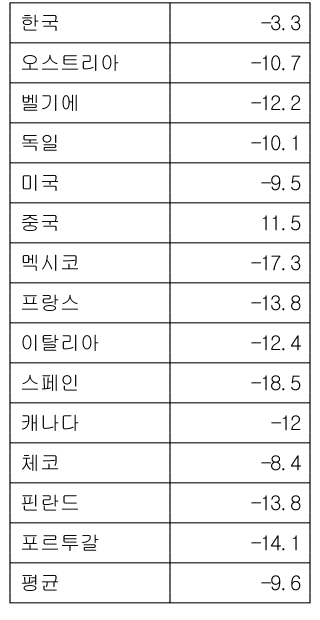 한국은 중국에 뒤졌지만 미국(-9.5%), 독일(-10.1%), 프랑스(-13.8%), 이탈리아(-12.4%), 스페인(-18.5%)보다 감소폭이 작았다. 최근 성장률을 발표한 14개국의 2분기 성장률 평균은 -9.6%다.